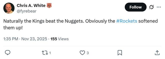 正如赛后火箭记者Chris A. White所说,掘金队不出意料爆冷输给了国王队,因为昨天火箭队大大消耗了掘金队。