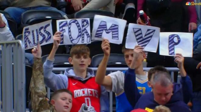 面对本场比赛末节梦回巅峰的威少,现场身穿威少火箭时期0号球衣的小球迷也举起威少MVP的牌子。