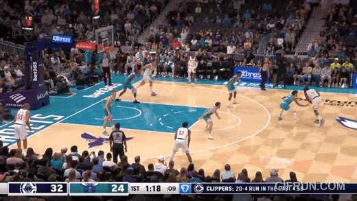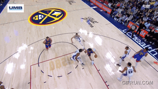 一个击地喂沃特森上篮,前因是接球不稳,拉文夹击,约基奇接球落地,转身击地,沃特森内切扣篮。