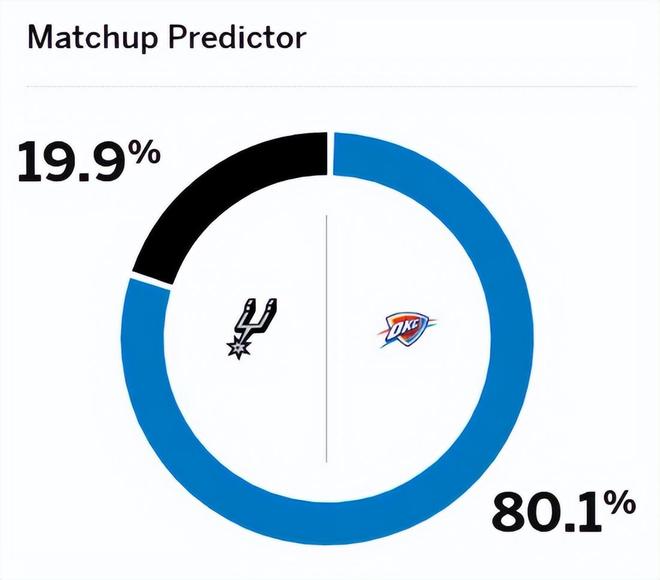 赛前,美媒ESPN对本场比赛进行了胜率预测,雷霆队胜率高达80.1%,马刺队胜率则仅有19.9%,差距依旧非常大。