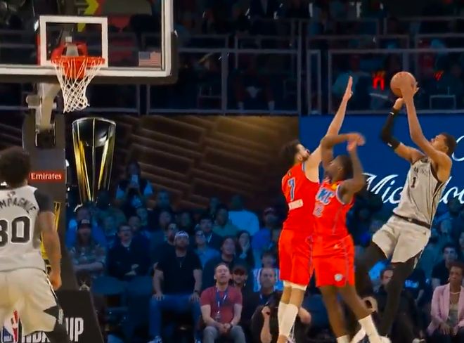 第四节决战,切特单打文班亚马欲跳投,文班亚马劈头盖脸大帽扇飞,卡鲁索反击炸裂单臂暴扣连拿4分,双方战至平手。文班漂移中投被推腰,依旧无解轰进,随后一抢三再造犯规,最终,马刺111-109爆冷击败雷霆,完成16分大逆转,终结对手16连胜。